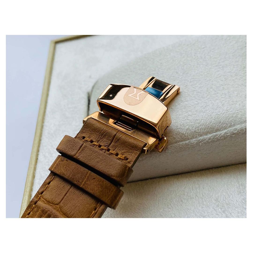 بند چرمی با عرض حدود ۲۰ میلیمتر، ترکیبی از راحتی و نمای رسمی فراهم میکند و ترکیب کل اجزاء باعث شده است که ساعت لحظهای بهعنوان انتخابی کلاسیک و شکیل برای استفاده در موقعیتهای رسمی یا کاری باشد.