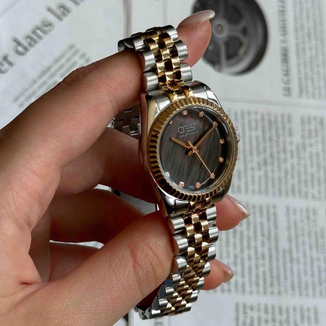 در داخل کیس دستگاه، موتور ژاپنی قرار دارد که انرژی خود را از باتری دریافت میکند. صفحه آنالوگ مشکی رنگ که با 12 کریستال زیبا تزیین شده است، توسط یک شیشه معدنی محافظت میشود. مقاومت ساعت مچی استیل زنانه Crest مدل 6-6166 در برابر آب، تا عمق 30 متر است. بنابراین میتواند حداقل تماس با آب مانند باران یا شستشوی دستی را تحمل کند.