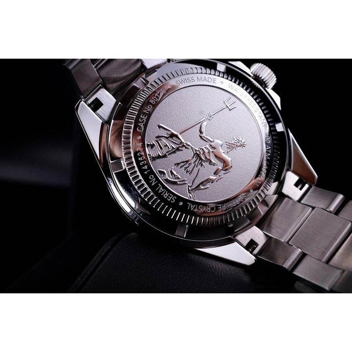 از نظر طراحی، بدنهی پشت ساعت دارای حکاکی پرترهی نپتون (خدای دریاها در اساطیر) است که نهتنها نمای بصری جذاب ایجاد میکند، بلکه به ریشهی هویتی این کالکشن “Neptunian / Skydiver” ارجاع دارد. بند این ساعت فلزی است و قفل ایمنی حرفهای (safety clasp) دارد که در شرایط سخت غواصی اطمینان را افزایش میدهد.
