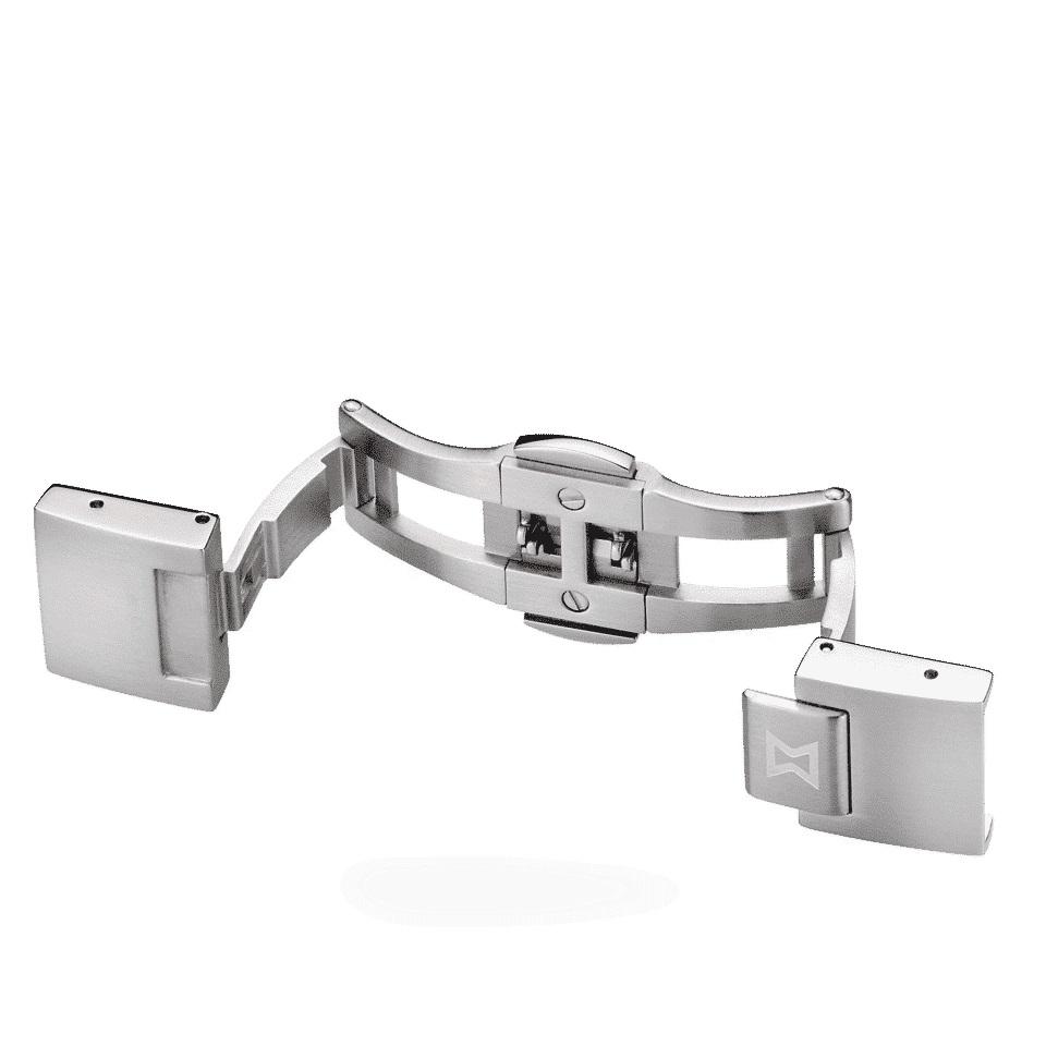 بند ساعت از استیل است و قفل پروانهای دارد (butterfly clasp) که هم امنیت بالایی دارد و هم ظاهر لوکس-محور را حفظ میکند.