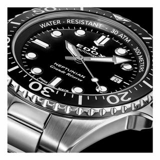 ساعت Edox 80801-3NM-NIN از مجموعه Neptunian Grande Réserve یک انتخاب حرفهای و قابلاعتماد برای کسانی است که هم به غواصی جدی فکر میکنند و هم دنبال حس لوکس ساعتسازی سوئیسیاند. قاب ۴۲ میلیمتری از استیل ۳۱۶L با ضخامت حدود ۱۲٫۳ میلیمتر حس استحکام و دوام را به خوبی منتقل میکند، در حالی که وزن تقریبی ۱۷۵ گرم تعادل مناسبی میان مچپذیری و حضور محسوس دارد.