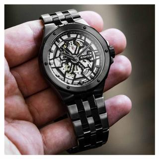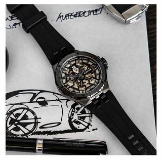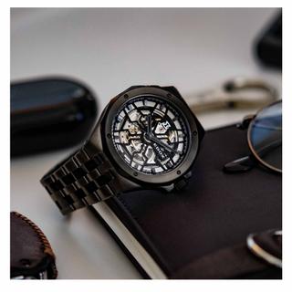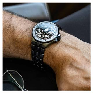 بند ساعت از استیل با پوشش PVD همرنگ با قاب است، که این هماهنگی رنگی باعث میشود ظاهر ساعت بسیار منسجم و حرفهای باشد. قسمت پشتی قاب (case-back) بهصورت شیشهای (See-through) طراحی شده تا بتوان موومنت زیبا و اسکلتون را از پشت نیز مشاهده کرد.