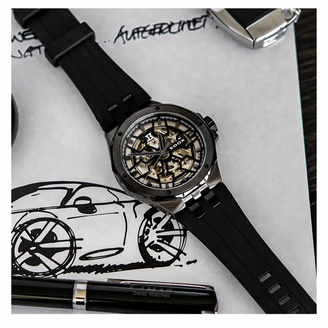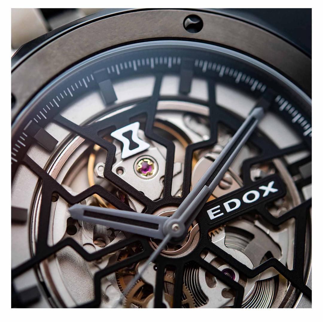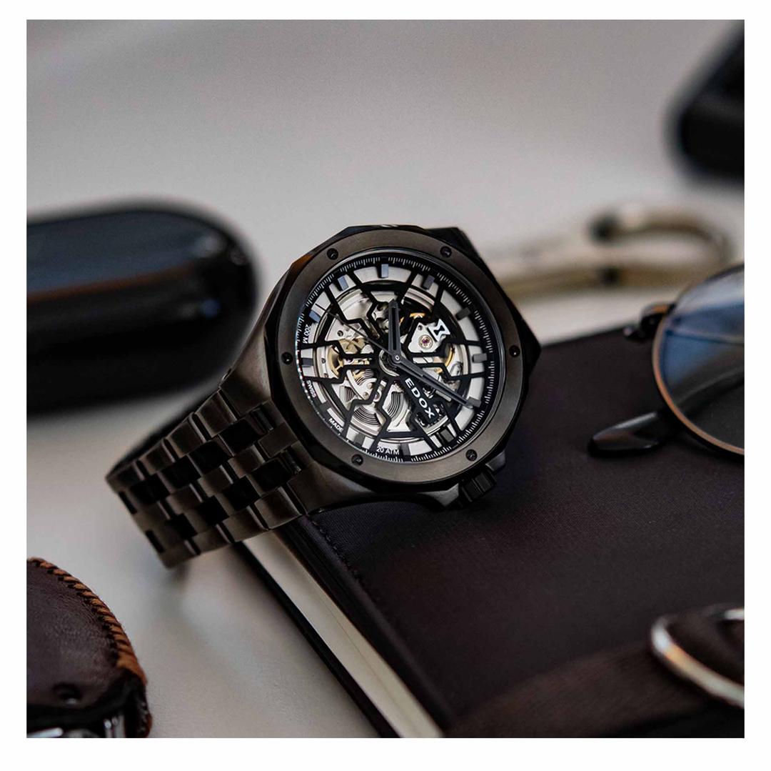 این ساعت یکی از نمادینترین مدلهای «Delfin Mecano» از Edox است ترکیبی جسورانه از طراحی مهندسی، مقاومت باورنکردنی در آب و احساسی مکانیکی بسیار فنی. قاب آن از استیل با پوشش PVD خاکستری ساخته شده و قطرش ۴۳ میلیمتر است، پهنایی که حس استحکام و اعتماد را روی مچ منتقل میکند.