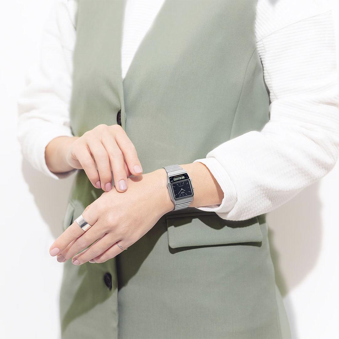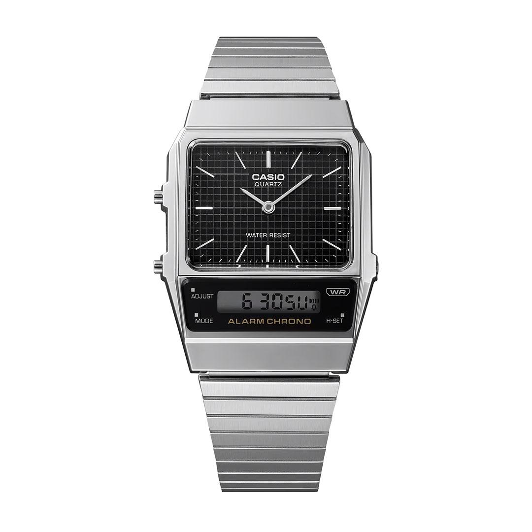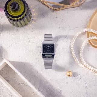 ساعت مچی کاسیو مدل AQ-800E-1A با طراحی رترو و الهامگرفته از دهه ۱۹۸۰ است که به زیبایی دوگانگی نمایش آنالوگ (عقربهای) و دیجیتال (صفحه LCD جداگانه) را در قابی مستطیلی شکل ارائه میدهد. این ساعت مچی unisex دارای بدنهای از جنس رزین با روکش کروم و یک بند استیل ضدزنگ نقرهای با قابلیت تنظیم است که ظاهری شیک و کلاسیک به آن میبخشد.