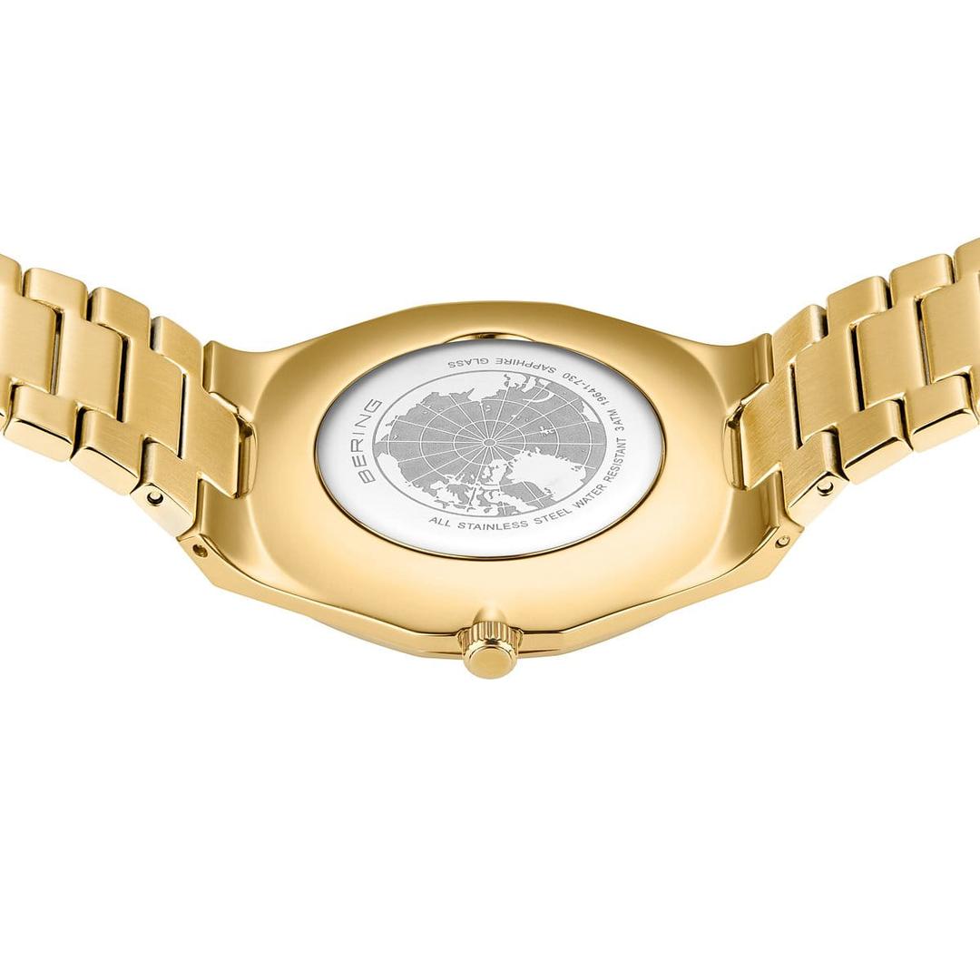 قاب و بند ساعت برینگ مدل B19641-730 از جنس استیل ضدزنگ طلایی هستند. قطر قاب 41 میلیمتر و عمق آن 5 میلیمتر است. دستگاه توسط یک موتور کوارتز دقیق تغذیه میشود.