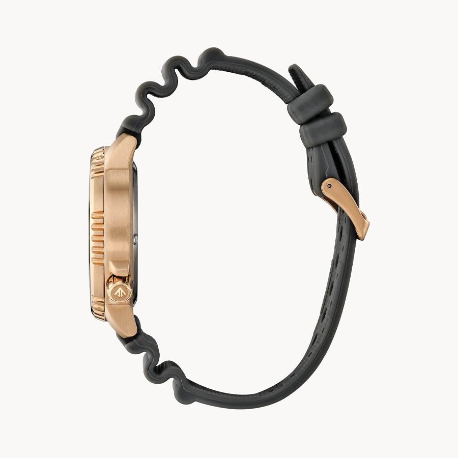 یک ساعت اسپرت مردانه با نمایشگر تک زمانه به رنگ طوسی، همراه نمایشگر تاریخ و قاب تمام استیل 318 به رنگ رزگلد با طراحی خاص سری غواصی سیتیزن که الهام گرفته شده از پوست ماهی میباشد و به هیچ عنوان دچار پوسیدگی نمیشود و بند پولی اورتان که دوام بسیار بالایی دارد