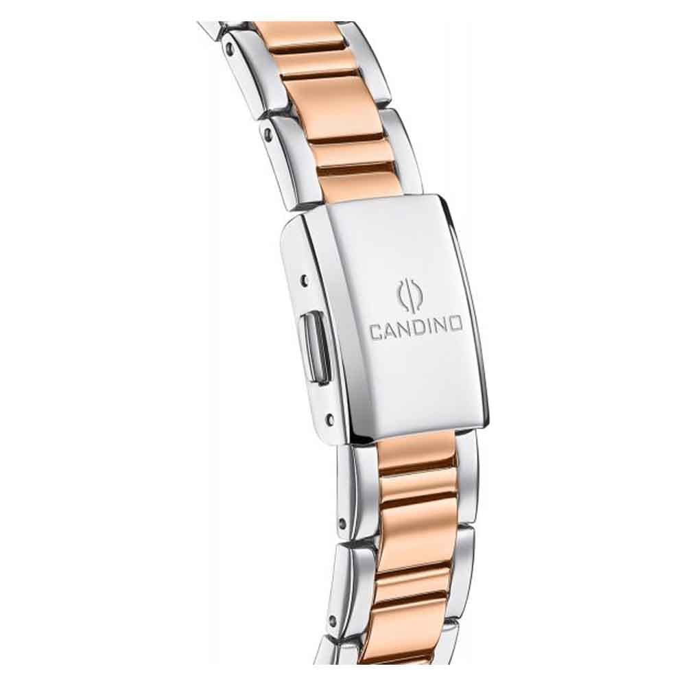 دستبند نقرهای استیل ضدزنگ با گیره تاشو امکان تنظیم آسان و دقیق را فراهم میکند. ساعت زنانه کاندینو مدل C4739-5 با قطر بدنه 33.0 میلیمتر و ارتفاع 8.4 میلیمتر، جلوه زیبایی بر روی مچ دارد. قاب گرد فولادی ضدزنگ، شیشه کریستال (یاقوت کبود) و دستبند استیل ضدزنگ با عرض 17.3 میلیمتر بر طراحی پیچیده و عملکرد صحیح این دستگاه تأکید دارد.
