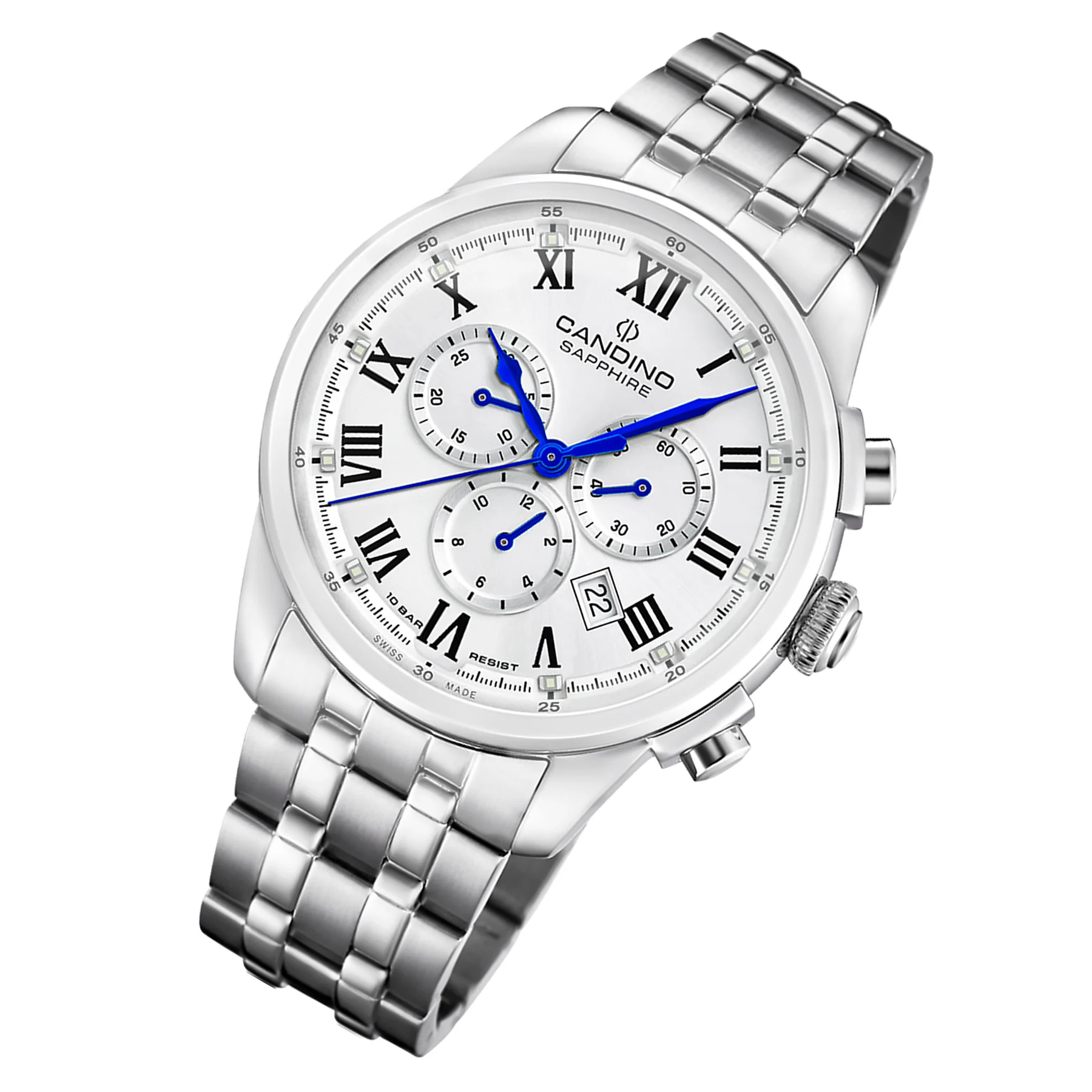 درون کیس ساعت یک موتور سوئیسی قرار دارد و در موقعیت عدد 4 یک نمایشگر تاریخ تعبیه شده است. این ساعت همچنین دارای عملکرد کرنوگراف است که در آن عقربه ثانیهشمار متعلق به کرونومتر است. صفحه سفید ساعت مچی کاندینو توسط یک شیشه ضد خش و ضد انعکاس محافظت میشود. این مدل تا عمق 100 متر در برابر نفوذ آب مقاوم است، بنابراین میتوانید با ساعت شنا کنید.