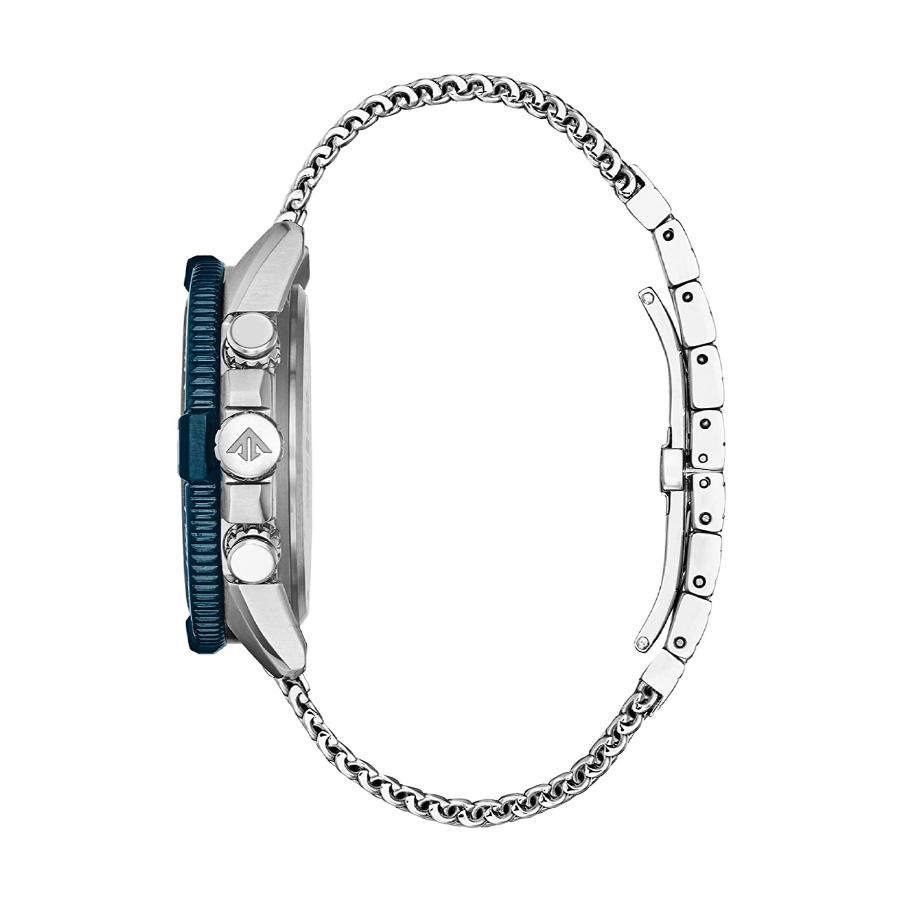 یک ساعت با استایل مردانه با نمایشگر کرنوگراف به رنگ سرمه ای،قاب با رنگ سرمه ای و نقره ای و بند استیل حصیری ساخته شده با استیل 318 که به هیچ عنوان دچار پوسیدگی نمیشود