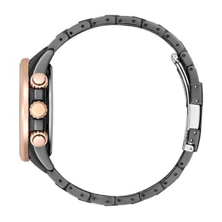 یک ساعت با استایل مردانه با نمایشگر کرنوگراف به رنگ مشکی و قاب و بند با رنگ خاکستری و رزگلد ساخته شده با استیل 318 که به هیچ عنوان دچار پوسیدگی نمیشود