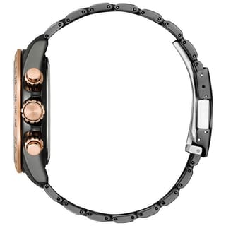 یک ساعت با استایل مردانه با نمایشگر کرنوگراف به رنگ سرمه ای و قاب و بند با رنگ خاکستری و رزگلد ساخته شده با استیل 318 که به هیچ عنوان دچار پوسیدگی نمیشود