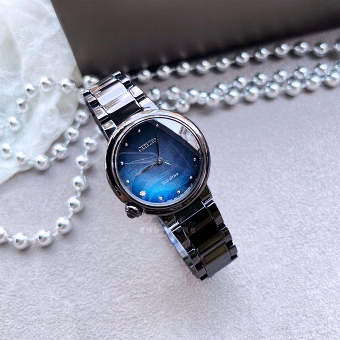محصول زنانه سیتیزن مدل EM0915-86N با طراحی ظریف و مدرن، از فناوری Eco-Drive بهره میبرد که با نور شارژ شده و نیازی به تعویض باتری ندارد. قاب و بند این ساعت بند فلزی زنانه از جنس استیل ضدزنگ با رنگ مشکی ساخته شده و صفحه آبی صدفی آن با نشانگرهای کریستالی و عقربههای همرنگ بدنه تزیین شده است. شیشه کریستال سافایر از صفحه ساعت در برابر خراش و ضربه محافظت میکند.