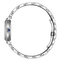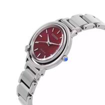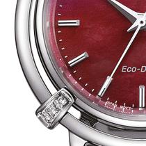 اکسسوری زنانه سیتیزن مدل EM1090-78X دارای قابی از جنس استیل ضدزنگ نقرهای و بندی با همین جنس و طراحی حلقههای پیوسته است. این ساعت بند فلزی زنانه با بهرهگیری از فناوری Eco-Drive، انرژی خود را از نور تامین میکند. صفحه محصول قرمز رنگ است و در محل اتصال بند به قاب، نگینهای ظریفی برای تزیین بهکاررفته است.