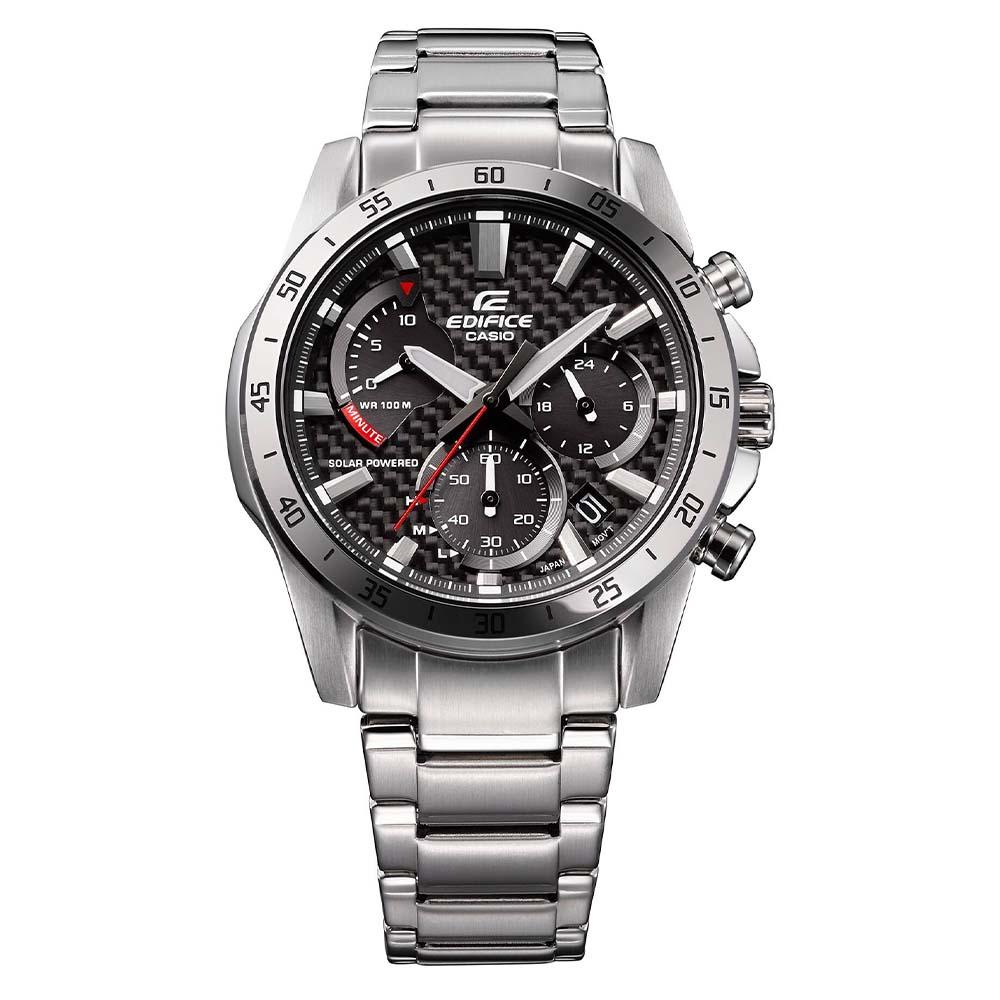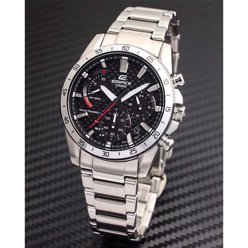 Casio Edifice EQS-930D-1AV یکی از 4 کرنوگراف کوارتز خورشیدی جدید است که از مسابقات اتومبیلرانی الهام گرفته است. این محصول جدید به صفحه فیبر کربنی و قاب یونی مجهز شده است. این ساعت مچی مردانه با انرژی خورشیدی کار میکند و زمانی که کاملاً شارژ شود، انرژی کافی را برای پنج ماه استفاده معمولی ذخیره میکند و نیازی به تعویض باتری ندارد.