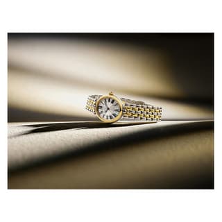 قاب بیضیشکل ۳۰ × ۲۵ میلیمتری از استیل ضدزنگ با روکش طلای زرد، جلوهای لوکس و درخشان به ساعت میبخشد. صفحه صدفی سفید با نقش حکاکیشدهی Clous de Paris و اعداد رومی مشکیرنگ، علاوه بر زیبایی، خوانایی و عمق بصری خاصی ایجاد میکند.