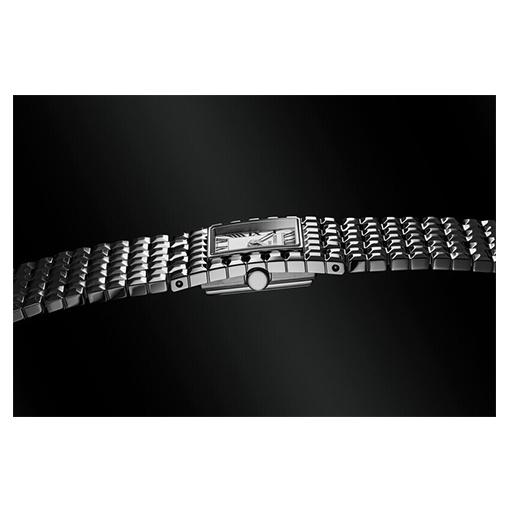 قاب مستطیلی یا تقریباً مربعشکل با ابعاد ۲۵٫۷ × ۲۰ میلیمتر، از استیل ضدزنگ ساخته شده و طراحیشده تا روی مچ دست بانوان جلوهای متین و ظریف داشته باشد. صفحه ساعت با رنگ سفید مات و اعداد رومی چاپشده، ترکیبی ظریف و خواناست که همراه با عقربههای رنگ نقرهای، فضایی از اصالت و آرامش در ظاهر ایجاد میکند.