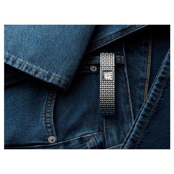 بند این ساعت از نوع فلزی با طراحی هفت-رشتهای و نقش برجستهی Clou de Paris است که حس آرایششده و مدرن را به ساعت میبخشد، در حالی که ساختار آن همچنان متناسب با استایل روزمره و رسمی بانوان طراحی شده است.