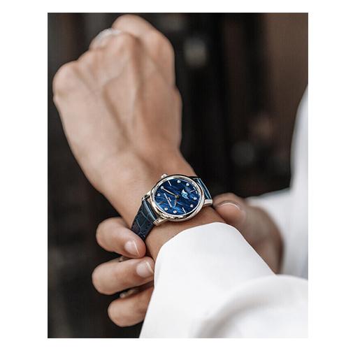 ظاهر این مدل با قاب استیل ضدزنگ و صفحه صدفی آبی دلنواز، فضایی از آرامش و وقار به مچ دست میآورد. هشت نشانگر الماسی که بهکار رفتهاند، در نقاط حساس صفحه قرار دارند و به ظرافت طراحی افزودهاند. نمایشگر مخصوص فاز ماه (Moonphase) در پایین صفحه، حس شاعرانهای از حرکت آسمان را به طراحی ساعت اضافه میکند—عنصری که جدا از عملکرد زمان، ارزش نمادین نیز دارد.