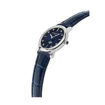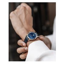 بند چرمی گاوی به رنگ آبی با عرض ۱۵ میلیمتر، در هماهنگی کامل با رنگ صفحه طراحی شده و حس لطافت و نرمی را برای دست فراهم میکند. قفل سگکی ساده، امنیت در استفاده را تضمین میکند. مقاومت ۳۰ متر به شما امکان میدهد ساعت را با اطمینان در شرایط عادی روزانه همچون تماس با رطوبت جزئی استفاده کنید بدون نگرانی از نفوذ آب.