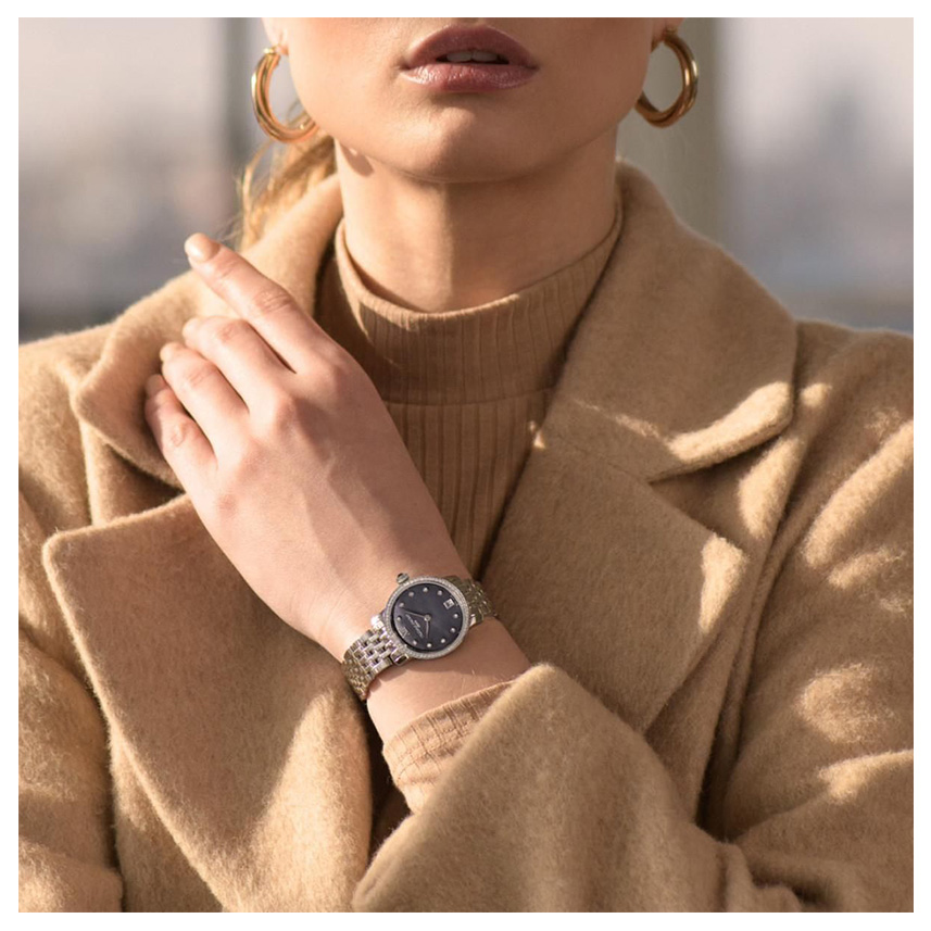 ساعتی زنانه از کالکشن Slimline Ladies Classics که با زیبایی ظاهری بالا و طراحی دقیق، جلوهای جواهری را به مچ دست شما میآورد.با قاب ۳۰ میلیمتری از استیل ضدزنگ و طراحی باریک ۷٫۶۵ میلیمتری، ساعت به شکلی متناسب و شیک روی مچ قرار میگیرد. صفحه مشکی صدفی به همراه بافت ملایم، درکنار ۱۰ نشانگر الماسی و ۶۸ الماس دور قاب، ترکیبی است از غرور و درخشش. موومنت کوارتز، کالیبر FC-220 (Base Ronda 785) دقت بالا و عملکرد مطمئن را تضمین میکند. شیشه یاقوت کبود ضدخش، محافظت کامل از صفحه را فراهم میکند. بند استیل چندلینکی با طراحی هفت ردیف، هم احساس راحتی دارد و هم ظاهری لوکس ارائه میدهد. مقاومت ۳۰ متر امکان استفاده در شرایط روزمره مانند تماس با رطوبت معمول را فراهم میکند — بدون آنکه برای عملکرد ساعت آسیبی ایجاد شود.