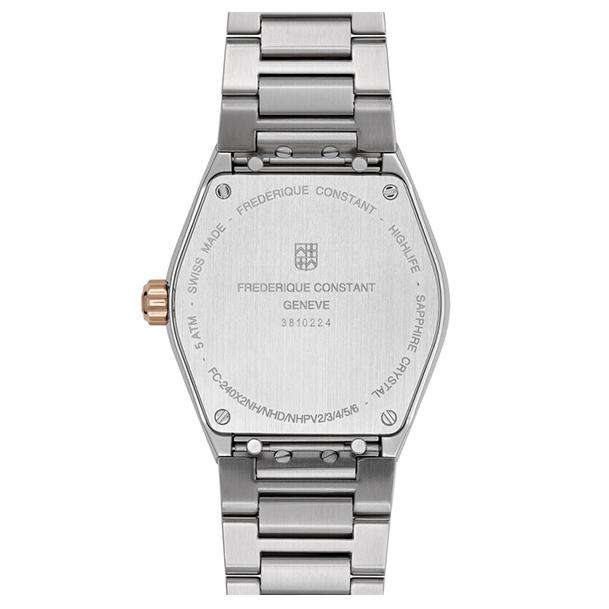 ساعت زنانه FC‑240CD2NH2B از کالکشن Highlife فردریک کنستانت، ترکیبی از طراحی کلاسیک سوئیسی، عملکرد دقیق کوارتز و جلوهای لوکس است. قاب ۳۱ میلیمتری از استیل ضدزنگ با روکش رزگلد و صفحه قهوهای با بافت مات و ۸ الماس در شاخصهای ساعت، ظاهری شیک و متین به ساعت بخشیده است.