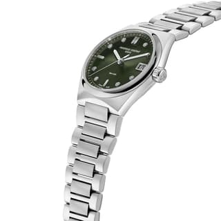 ساعت زنونه FC-240GRD2NH6B از سری Highlife فردریک کنستانت، نمایانگر تلفیقی از طراحی لوکس و دقت سوئیسی است. این مدل با قاب گرد ۳۱ میلیمتری از استیل ضدزنگ صیقلی و صفحهای سبز با پرداخت sunray، جلوهای چشمگیر و جذاب دارد. حضور ۸ الماس در شاخصهای ساعت، ظرافت و درخشندگی را به طراحی افزوده است.