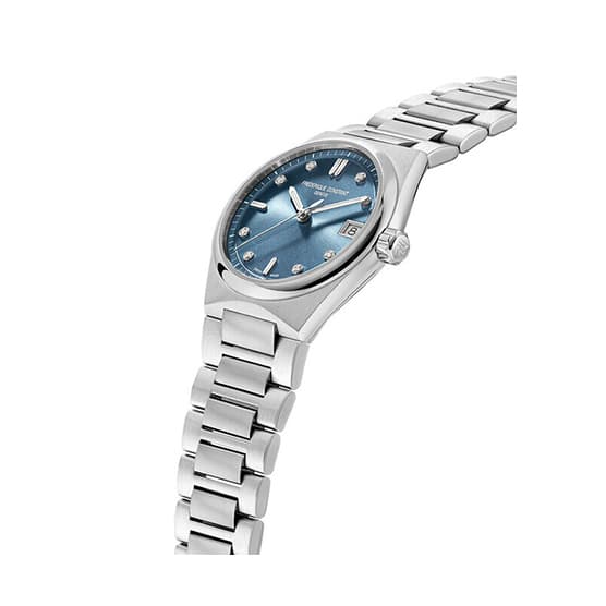 ساعت زنونه FC-240LND2NH26B از کالکشن Highlife Ladies Quartz فردریک کنستانت، تبلور طراحی امروزی با روح کلاسیک ساعتسازی سوئیسی است. این مدل با قاب ۳۱ میلیمتری استیل و ضخامت ۷٫۲۹ میلیمتر، روی مچ دست ظریف جلوهای متین و خوشفرم دارد. طراحی یکپارچه بند با قاب، باعث شده ساعت به شکلی ماهرانه و هماهنگ در دست قرار بگیرد.