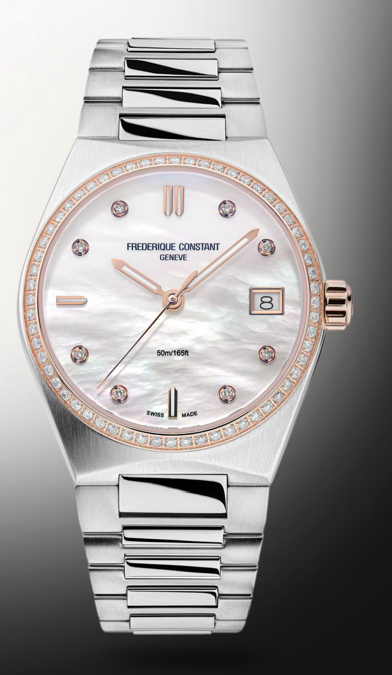 ساعت زنونه FC-240MPWD2NHD2B-SS از سری Highlife فردریک کنستانت، ترکیبی از ظرافت لوکس، طراحی امروزی و عملکرد دقیق کوارتز است. قاب ۳۱ میلیمتری آن با روکش دو رنگ استیل و رزگلد، همراه با bezel چرخان مملو از الماس (۶۰ الماس در ساختار بیرونی) جلوهای خیرهکننده و در عین حال متین به ساعت میبخشد.