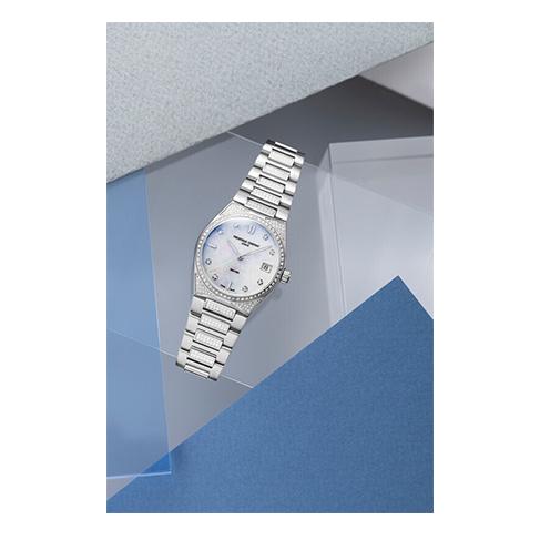 صفحه صدفی سفید (Mother‑of‑Pearl) با شاخصهای ترکیبی شامل ۸ الماس کوچک در موقعیتهای ۳، ۶، ۹ و ۱۲، درخشندگی ظریف و جلوهای جواهرگون به ساعت بخشیده است. شیشه سافایر کریستال ضدخش، وضوح بینظیری ارائه میدهد و حفاظت بالایی از صفحه فراهم میآورد.