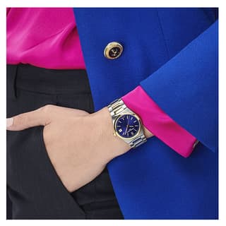 قاب ۳۴ میلیمتری از استیل ضدزنگ با پرداخت براق، تعادلی میان لطافت زنانه و استحکام ایجاد کرده است. صفحهی سرمهای براق با بافت مرکزی زیبا، جلوهای عمقدار دارد و شاخصهای نقرهای براق در کنار عقربههای ظریف، نمایی از دقت و ظرافت را در کنار هم به نمایش میگذارند. در موقعیت ساعت ۳، پنجره تاریخ بهصورت هماهنگ در صفحه جا گرفته تا کارایی ساعت کامل شود.
