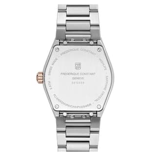 ساعت FC-240VD2NH2B از کالکشن Highlife Ladies Quartz برند Frederique Constant، ترکیبی از طراحی مدرن و کلاسیک را ارائه میدهد. قاب ۳۱ میلیمتری آن، با ترکیب استیل ضدزنگ و روکش PVD رزگلد، ظاهری شیک و جذاب دارد. صفحه نقرهای با پرداخت Sunray، جلوهای درخشان و عمقدار ایجاد میکند که با ۸ الماس درخشان بهعنوان نشانگر ساعت، به زیبایی آن افزوده شده است.