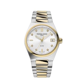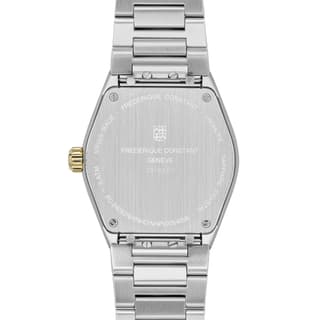 ساعت FC-240VD2NH3B از کالکشن Highlife Ladies Quartz برند Frederique Constant، ترکیبی از طراحی مدرن و کلاسیک را ارائه میدهد. قاب ۳۱ میلیمتری آن، با طراحی یکپارچه و بند استیل ضدزنگ با روکش PVD طلایی، ظاهری شیک و جذاب دارد. صفحه نقرهای با پرداخت Sunray، جلوهای درخشان و عمقدار ایجاد میکند که با ۸ الماس درخشان بهعنوان نشانگر ساعت، به زیبایی آن افزوده شده است.