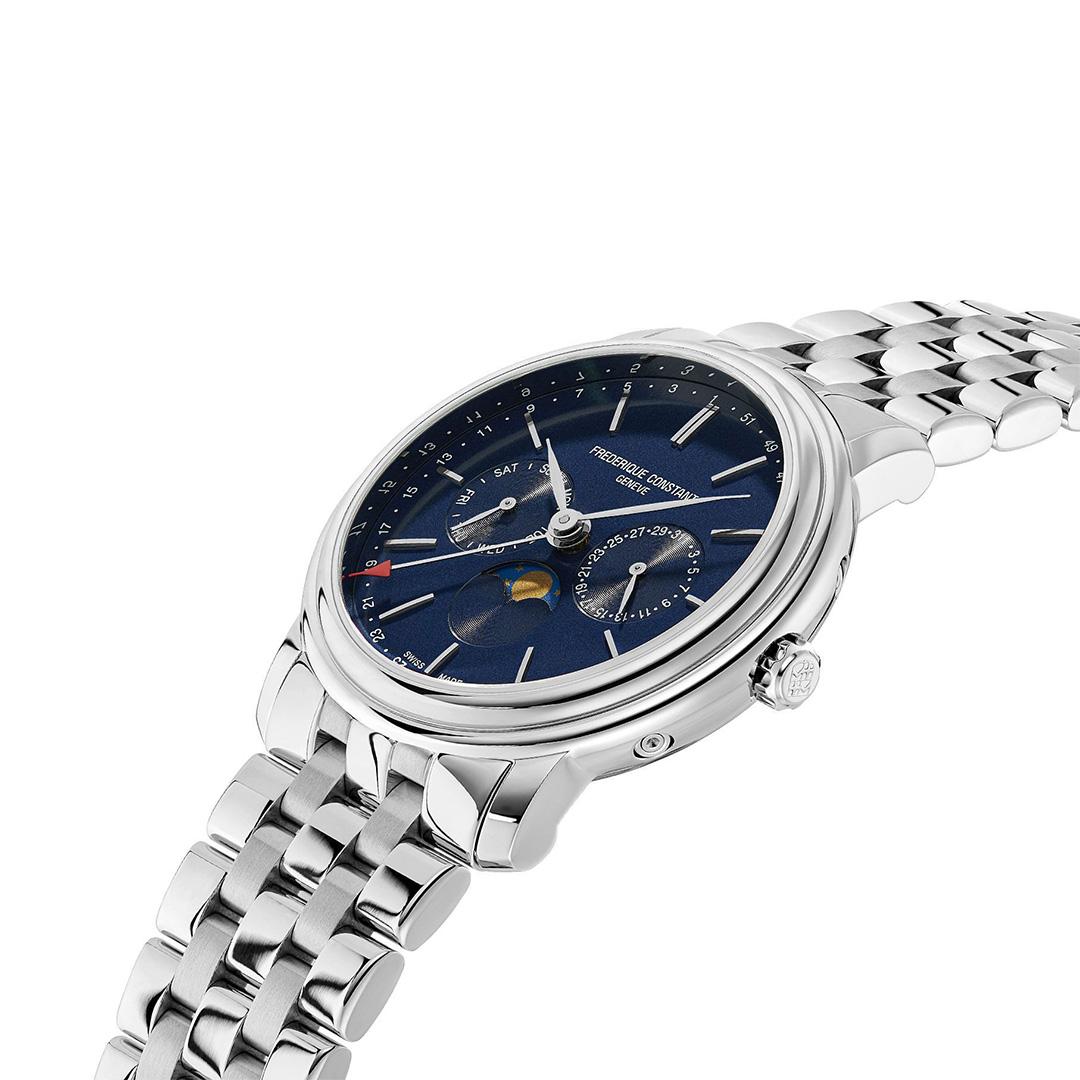صفحه سرمهای با پرداخت ظریف، عمق بصری واقعی ایجاد میکند؛ زیرشاخصهای نمایشگر روز هفته، تاریخ، شماره هفته و Moon phase به همراه شاخصهای خطی، کارایی بالا و خوانایی عالی را در کنار زیبایی بصری قرار دادهاند. موومنت کوارتز کالیبر FC-270 با دقت بالا و نگهداری ساده، به کاربر امکان میدهد تا بدون دغدغه از پیچیدگیهای مکانیکی، تجربهای مطمئن داشته باشد.