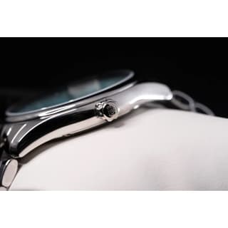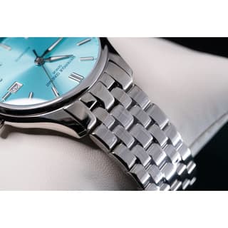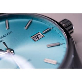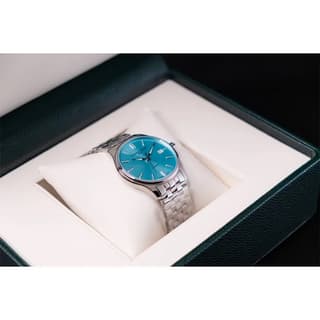 صفحه آبی با پرداخت دقیق و شاخصهای فلزی برجسته، جلوهای جذاب و چشمگیر ایجاد میکند — در نورهای مختلف درمییابی عمق و زیبایی رنگ آبی بیشتر به چشم میآید. عقربهها و شاخصها با ترمیمی ظریف چیده شدهاند تا خوانایی خوبی ارائه دهند. پنجره تاریخ در موقعیت ساعت ۳ بهصورت متناسب با طراحی کلی قرار دارد، بدون اینکه شلوغی به صفحه اضافه کند.