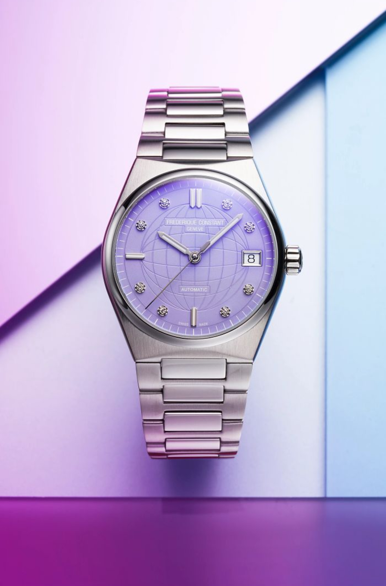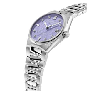 صفحهی لاوندر (بنفش روشن) با طراحی Globe (نقشه جهان) و شاخصهای الماسی، زیبایی و درخششی متعادل را ارائه میدهد. ۸ شاخص الماسی با وزن تقریبی ۰.۰۴ قیراط هر کدام، ضمن افزودن جلوه لوکس، بدون اغراق به طراحی ظریف ساعت کمک میکنند. شیشه سافایر کریستال با روکش ضدانعکاس تضمین میکند خوانایی بالا حتی در شرایط نوری مختلف حفظ شود.