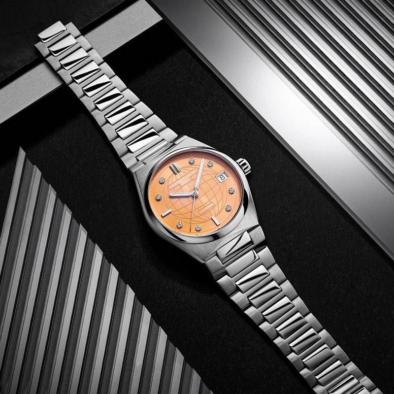 محصول زنانه فردریک کنستانت مدل FC-303OD2NH6B یک ساعت مچی اتوماتیک چشمگیر از مجموعه هایلایف است که ترکیبی از عناصر طراحی کلاسیک و مدرن را ارائه میدهد. این مدل دارای یک قاب استیل ضدزنگ صیقلی به قطر 34 میلیمتر است که یک صفحه نارنجی با طرح کره زمین در مرکز و هشت نشانگر الماسی را در خود جایداده و جلوهای لوکس به آن بخشیده است.