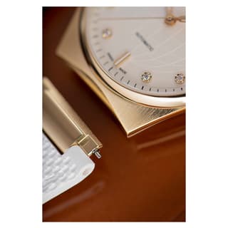 بند استیل ضدزنگ با پوشش طلایی PVD، راحتی و امنیت را در استفاده روزمره فراهم میکند. بند سیلیکونی سفید با سگک طلایی PVD بهعنوان بند اضافی، تنوع و گزینههای بیشتری برای استفاده فراهم میآورد. پشت قاب شیشهای با نمایی از موومنت، زیباییشناسی و جذابیت بصری ساعت را افزایش میدهد.