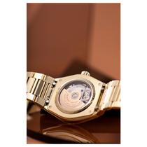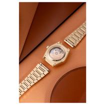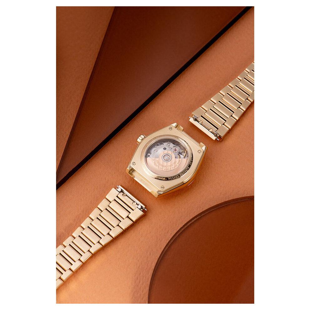 قاب ۳۴ میلیمتری استیل ضدزنگ با پوشش طلایی PVD، ترکیبی از ظرافت و دوام بالا ارائه میدهد و شیشه سافایر کریستال ضدخش با پوشش ضدانعکاس، وضوح و محافظت بینظیری از صفحه فراهم کرده است. صفحه نقرهای مات با الگوی کرهجهانی برجسته در مرکز، جلوهای کلاسیک و عمیق ایجاد میکند.