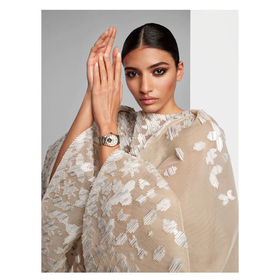 ویژگی متمایز این مدل، بازشوی Heart Beat در موقعیت ساعت ۱۲ است که بخش تعادل موتور (balance wheel) را نمایان میکند؛ این طراحی نمایی از “قلب مکانیکی” ساعت ارائه میدهد و حس فنیگرایی را تقویت میکند. صفحه نقرهای همراه با الگوی Globe در مرکز، جلوهای کلاسیک و متعادل به ساعت بخشیده است.