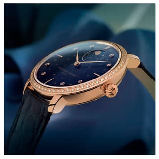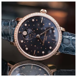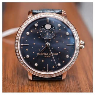 مدل FC-701NSD3SD4 از کالکشن Slimline Moonphase Stars Manufacture نمایندهای برجسته از ترکیب طراحی لوکس و مهندسی دقیق سوئیسی برند Frédérique Constant است. با قطر قاب ۳۸.۸ میلیمتر، این ساعت ابعادی متعادل دارد که هم برای استفاده رسمی و هم برای انتخابی شیک در موقعیتهای روزمره مناسب است. آبکاری رزگلد قاب همراه با صفحه سرمهای با طرح ستاره، جلوهای بسیار دلنشین و زنانهپسند ایجاد کرده است.