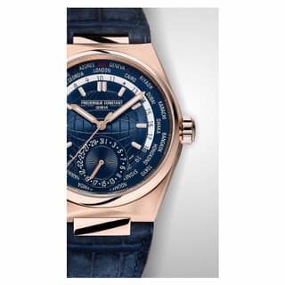 ساعت FC‑718BL4NH9 نمایندهای برجسته از کالکشن Highlife Worldtimer Manufacture است که با ترکیب طراحی لوکس، مهندسی داخلی و عملکرد جهانی، ارزش ویژهای پیدا کرده است. قاب ۴۱ میلیمتری روکشدار به رزگلد و صفحه آبی گلوبدار، ترکیبی زیبا از کلاسیک و مدرن ارائه میدهد که هم برای مجالس رسمی مناسب است و هم برای حضور روزمره.نقطه قوت اصلی این ساعت در قابلیت Worldtimer آن است یعنی نمایش همزمان زمان در نقاط مختلف جهان با حلقه شهری و دیسک ۲۴ ساعته.