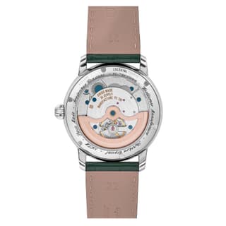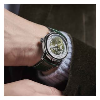 صفحهٔ ساعت با طراحی نقشهٔ جهان (Globe motif)، ترکیب رنگی حرفهای و شاخصهای لومی، جلوهای مدرن و در عین حال کلاسیک دارد. بند چرمی با رنگ سبز، هماهنگی زیبایی با قاب و صفحه ایجاد کرده و به استایل ساعت ابعاد ثانویهٔ لوکس میدهد.
