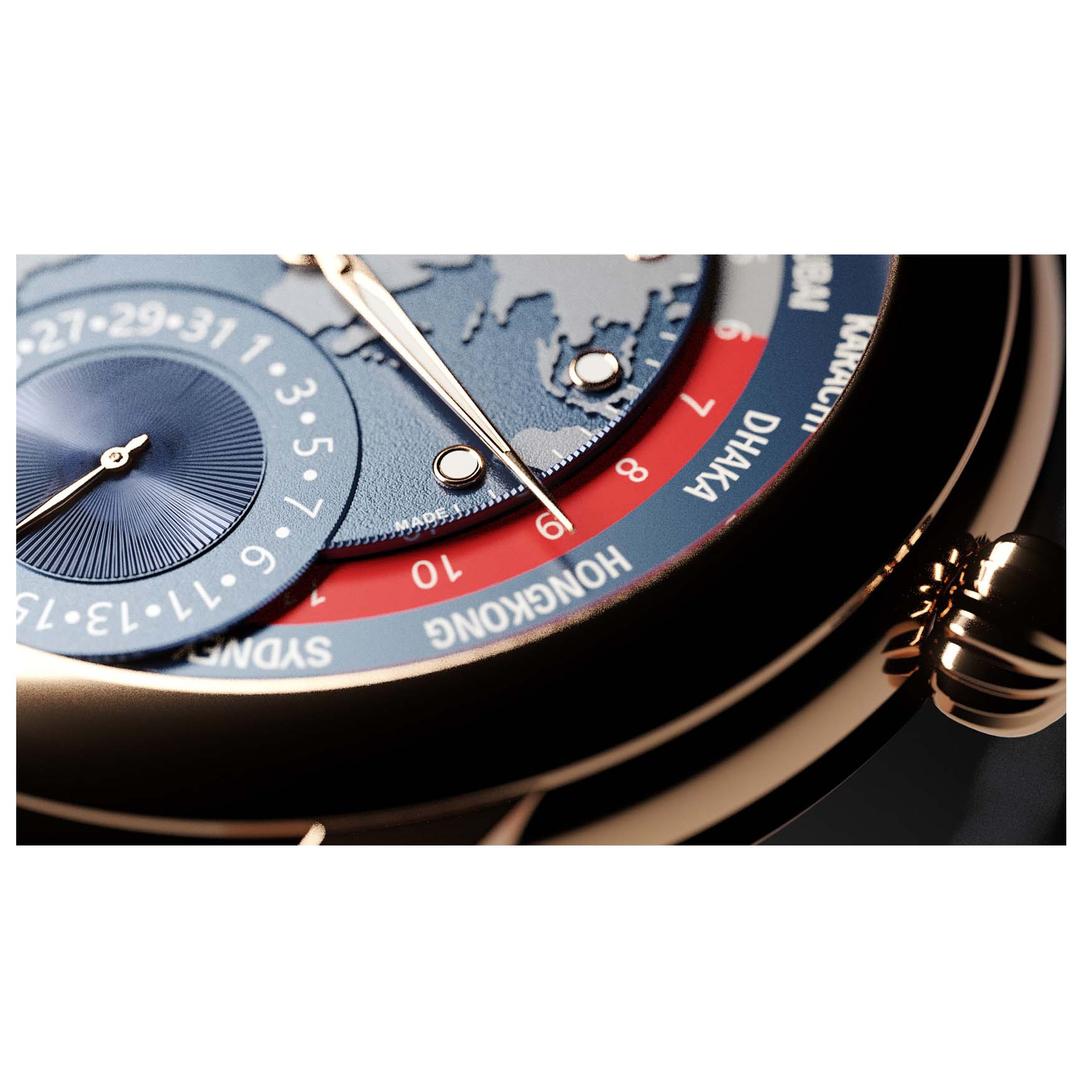 صفحه آبی با طراحی نقشه جهان (globe motif) همراه با حلقه شهرها و دیسک ۲۴ ساعته وظیفهٔ نمایش زمان جهانی (Worldtimer) را بر عهده دارد. زاویهبندی، تضاد رنگی و انتخاب آبی – خاکستری باعث شده خوانایی بالا حفظ شود و در عین حال جلوهای لوکس ارائه شود.