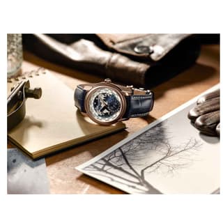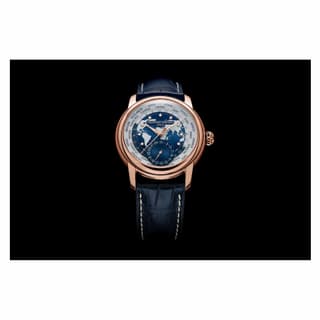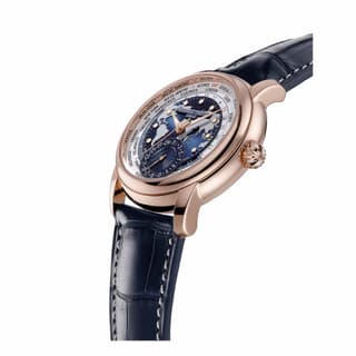 صفحه آبی با نقشه جهان برجسته، دیسک ۲۴ ساعته شبروز و حلقه شهرها، نمایشگرِ قابلیت Worldtimer این ساعت است — یعنی با یک نگاه به ساعت، میتوان زمان را در ۲۴ منطقهٔ مختلف دنیا خواند. لوگوی نقش جهان و طراحی عقربهها و شاخصها به گونهای تنظیم شدهاند که علاوه بر زیبایی، خوانایی بالا هم حفظ شود.