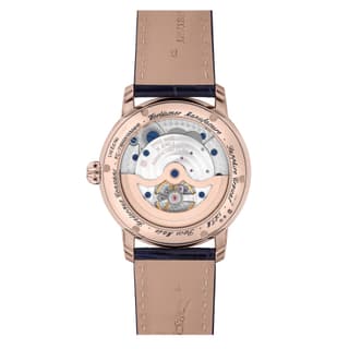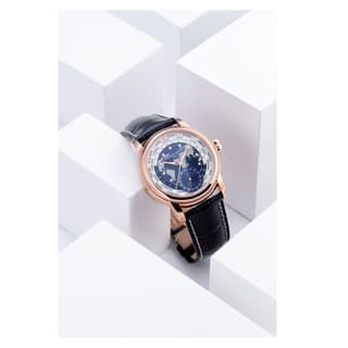 قاب ۴۲ میلیمتری ساختهشده از طلای رز ۱۸ عیار، با ضخامت ~۱۲٫۱۵ میلیمتر، کوچکی و ظرافت را با حضور چشمگیر ترکیب کرده است. طراحی تمام طلایی این مدل، در کنار رنگ آبی صفحه، تضاد بصری جذابی ایجاد کرده که آن را در کلاس ساعتهای لوکس برجسته میکند.
