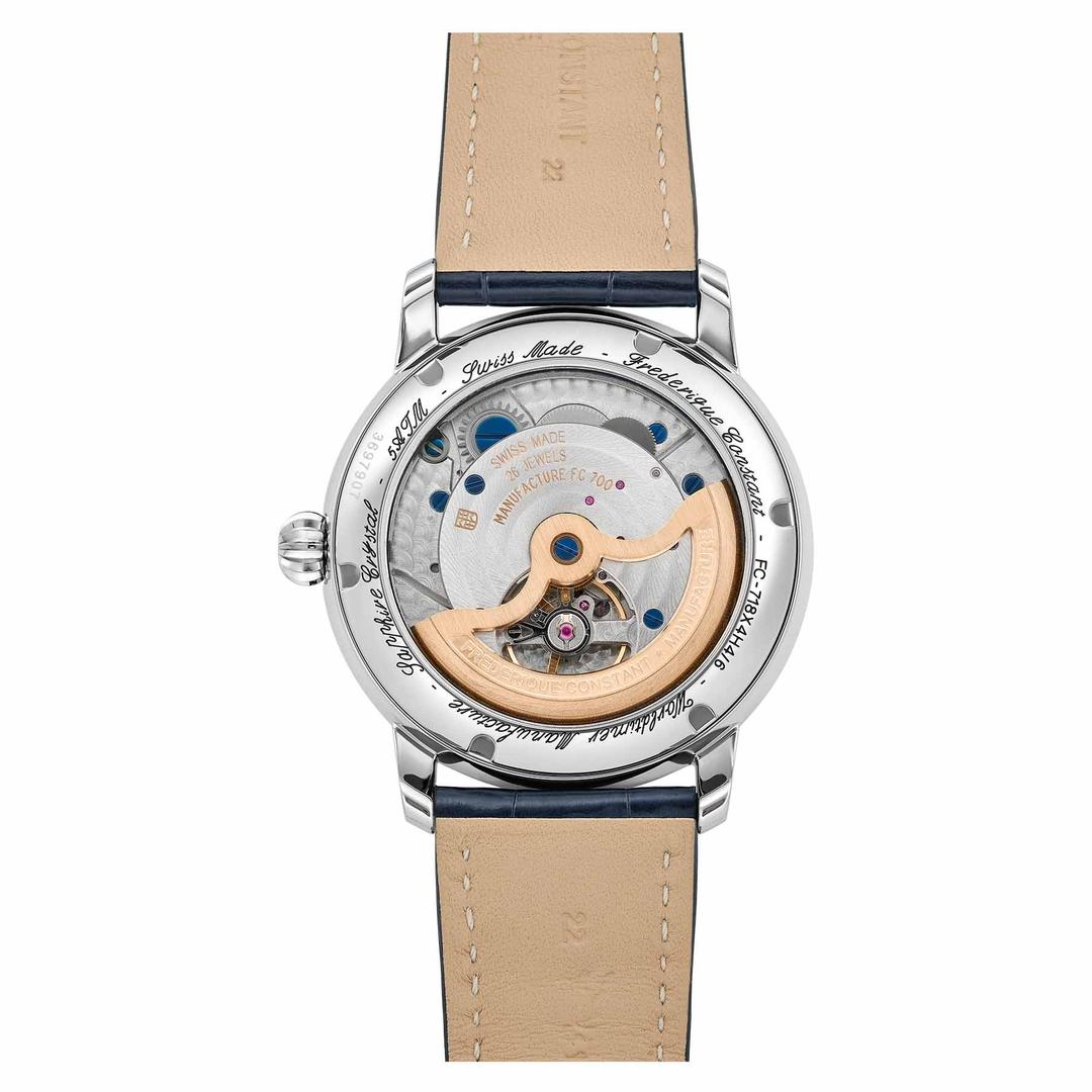 موومنت FC‑718، تولید داخلی فردریک کنستانت، با ۲۶ جواهر، فرکانس ۴ هرتز و ذخیره انرژی تقریباً ۳۸ ساعت، عملکردی قابل اعتماد و دقیق ارائه میدهد. طراحی داخلی آن شامل تزئیناتی مانند perlage و خطوط ژنو است که زیبایی درونی ساعت را نیز به نمایش میگذارد.
