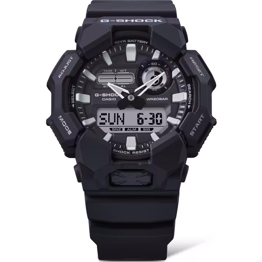 محصول کاسیو جی شاک مدل GA-010-1A یک ساعت مچی unisex آنالوگ - دیجیتال با طراحی حجیم و اسپرت است که به مقاومت در برابر ضربه و آب تا عمق 200 متر مشهور است. بدنه و بند محصول از جنس رزین مشکی ساخته شدهاند.