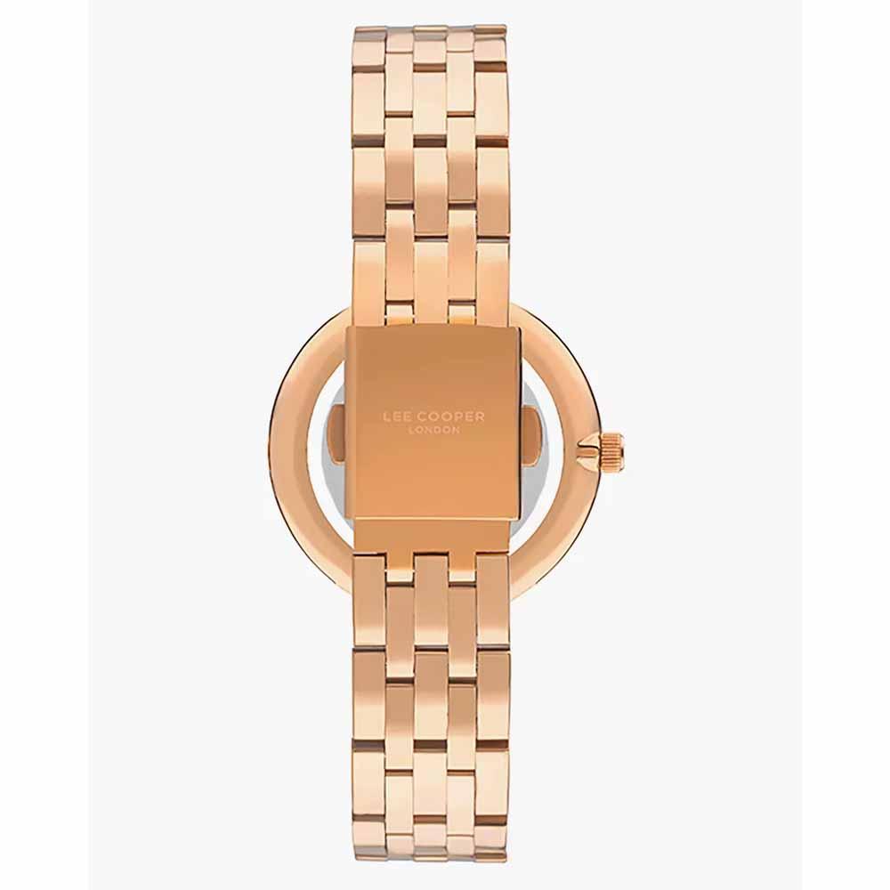 ساعت مچی زنانه رزگلد لی کوپر مدل LC07502.420 دارای طراحی شیشه کریستال معدنی تراش خورده و صفحه صدفی میباشد و قطر صفحه آن 35 میلی متر است . و تا عمق 30 متر ضد آب میباشد.