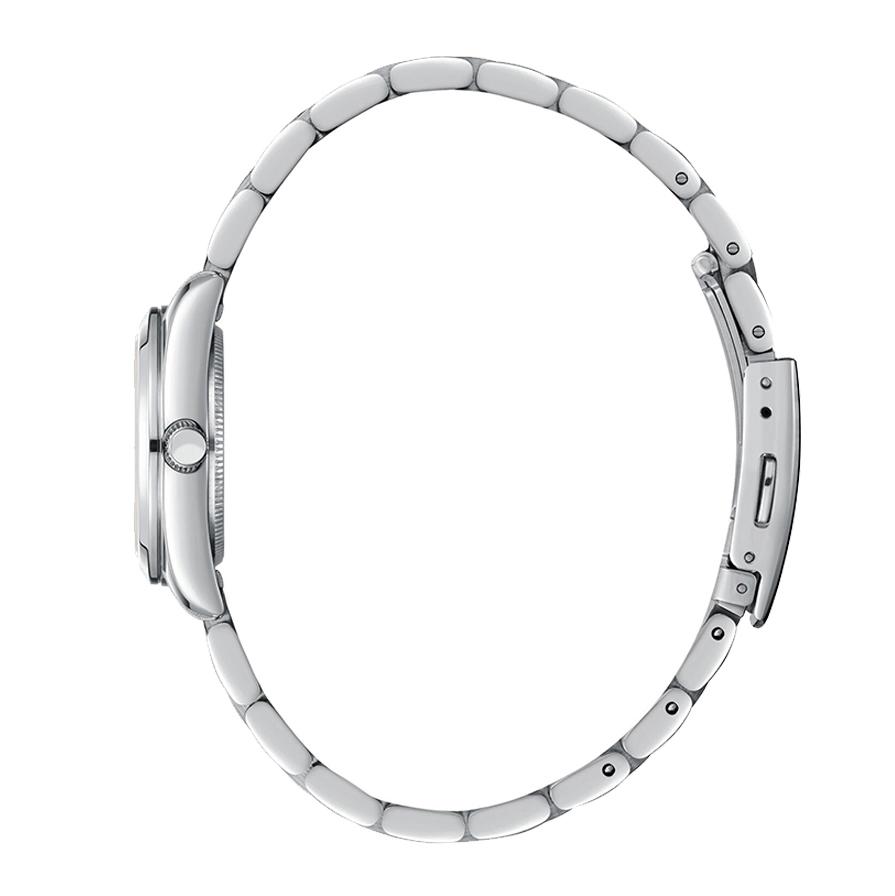 ساعت مچی زنانه لی کوپر مدل LC08190.320 یک تایمپیِس کلاسیک و مهندسیشده برای بانوانی است که به دنبال ترکیب ظرافت، دقت و دوام هستند. قاب استیل ضدزنگ آن با قطر ۲۸ میلیمتر و ضخامت حدود ۷ میلیمتر، تعادل ایدهآلی بین سبک بودن و مقاومت فراهم میکند و برای مچهای ظریف بانوان بسیار مناسب است. صفحه سفید ساده با عقربهها و نشانگرهای نقرهای پولیششده، علاوه بر زیبایی، خوانایی بالا را حتی در نور کم تضمین میکند.
