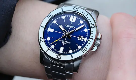 ساعت مچی مردانه کاسیو مدل MTP-VD01D-2E، با طراحی اسپرت - کلاسیک و تمرکز بر خوانایی و دوام، یک انتخاب محبوب و مقرونبهصرفه است. این ساعت با ابعاد قاب تقریبی ۴۹ × ۴۵ × ۱۰.۳ میلیمتر و وزن حدود ۱۱۸ گرم، اندازهای متعادل دارد که روی مچ اکثر آقایان بهخوبی قرار میگیرد.